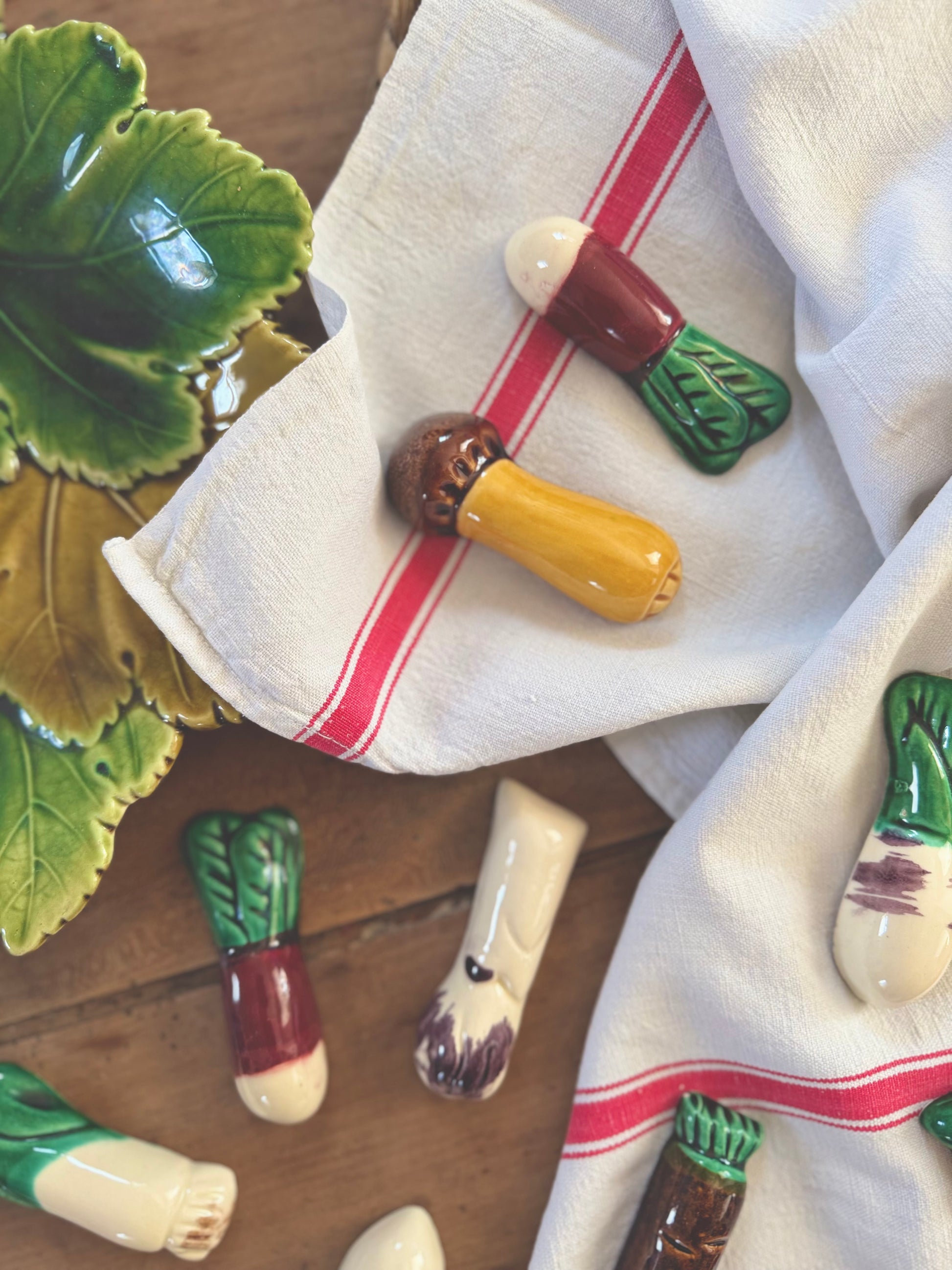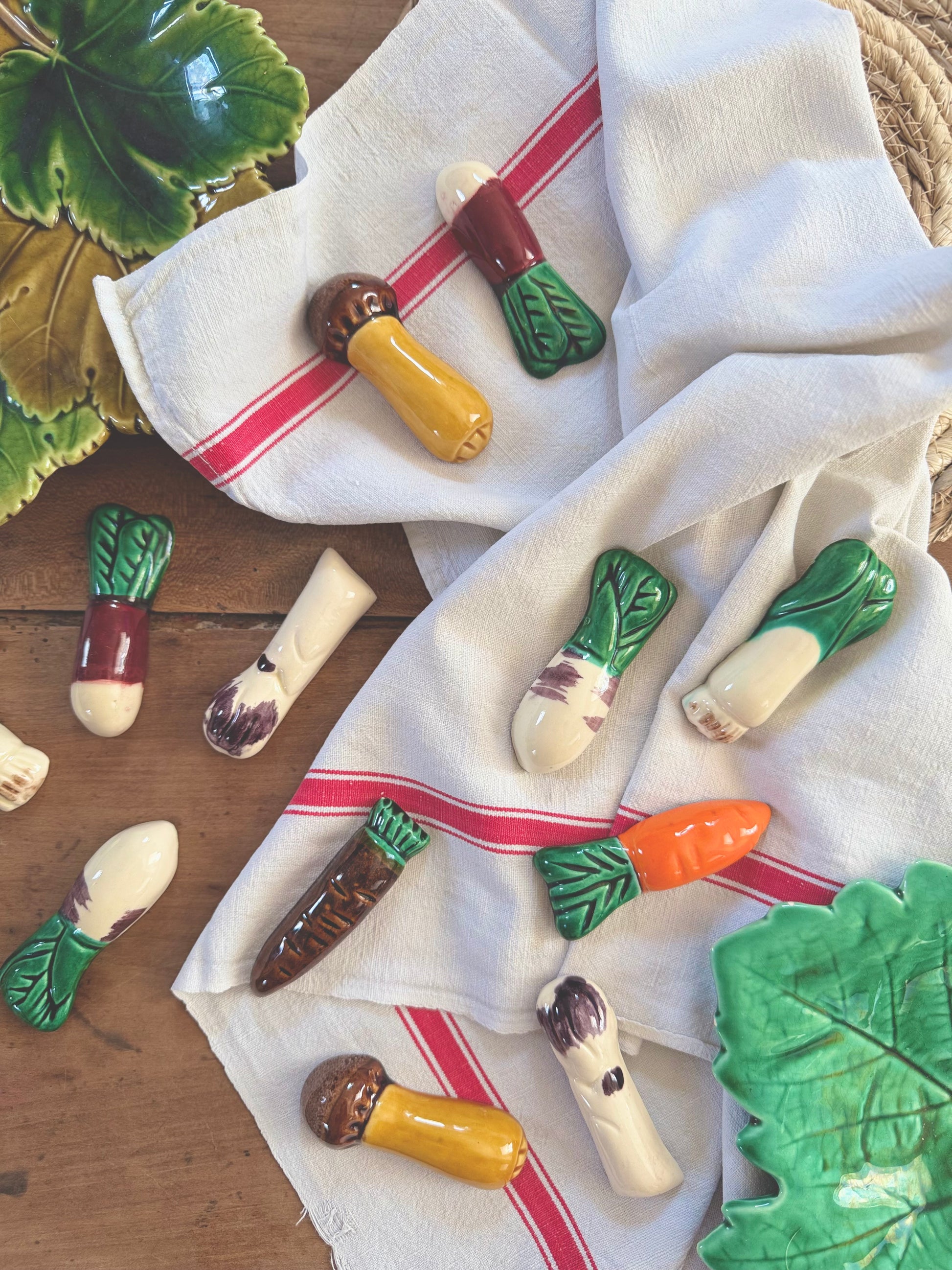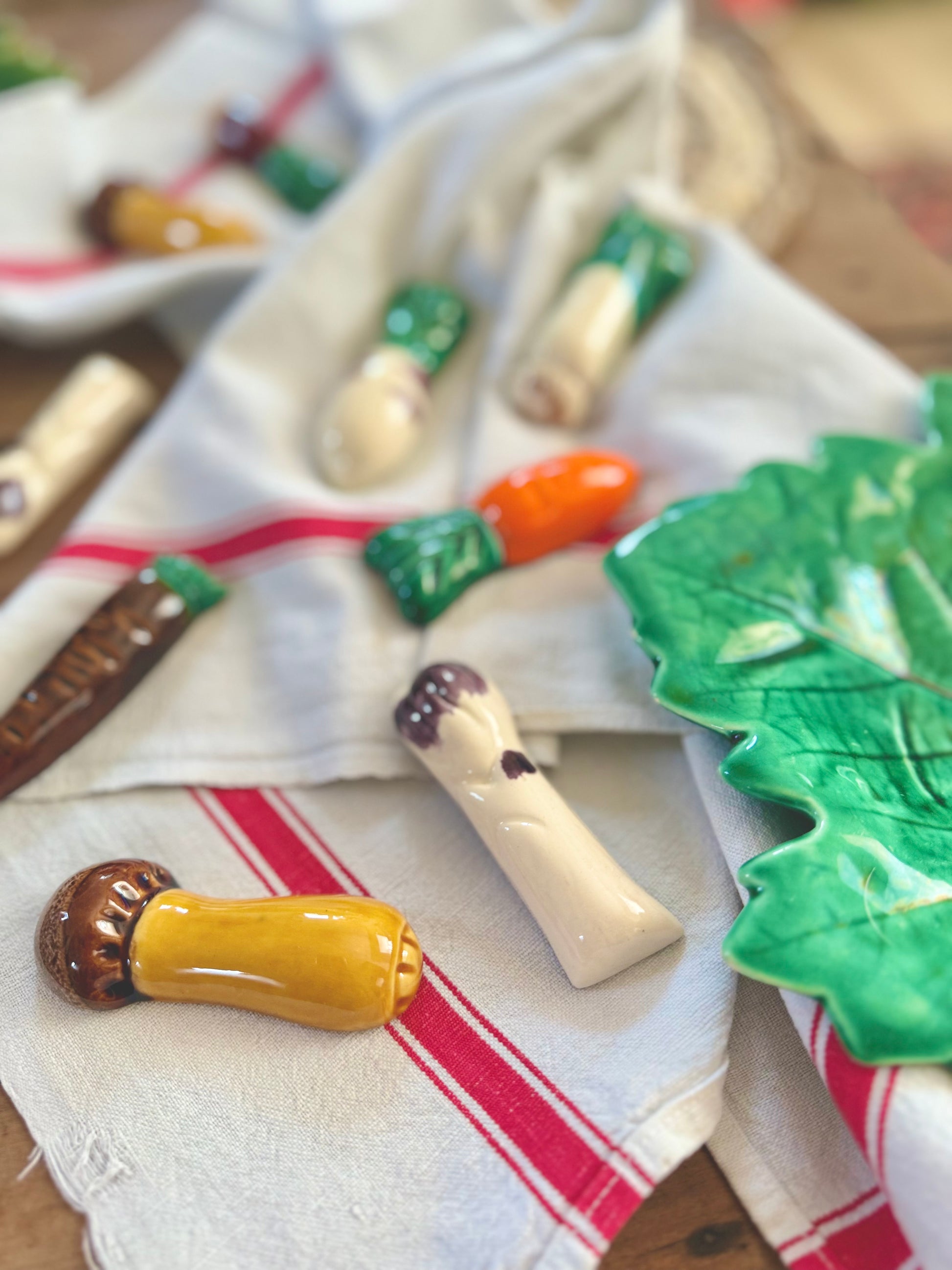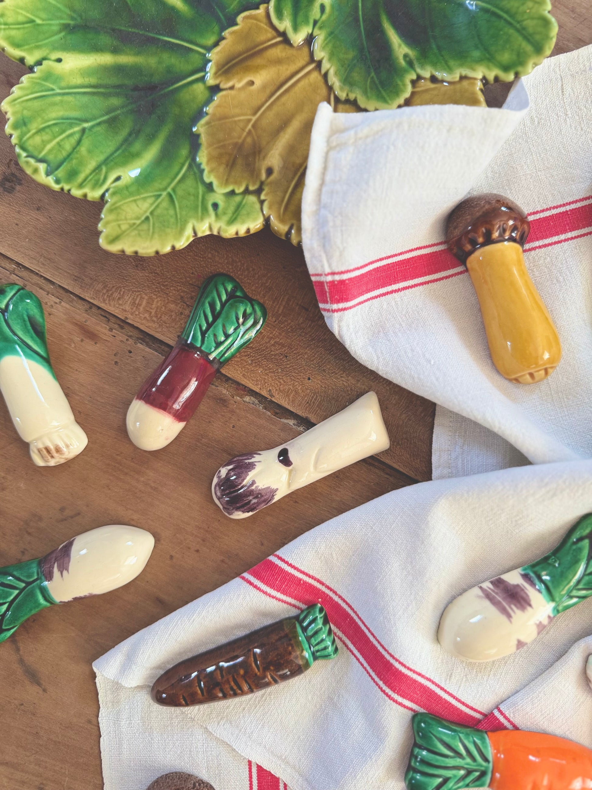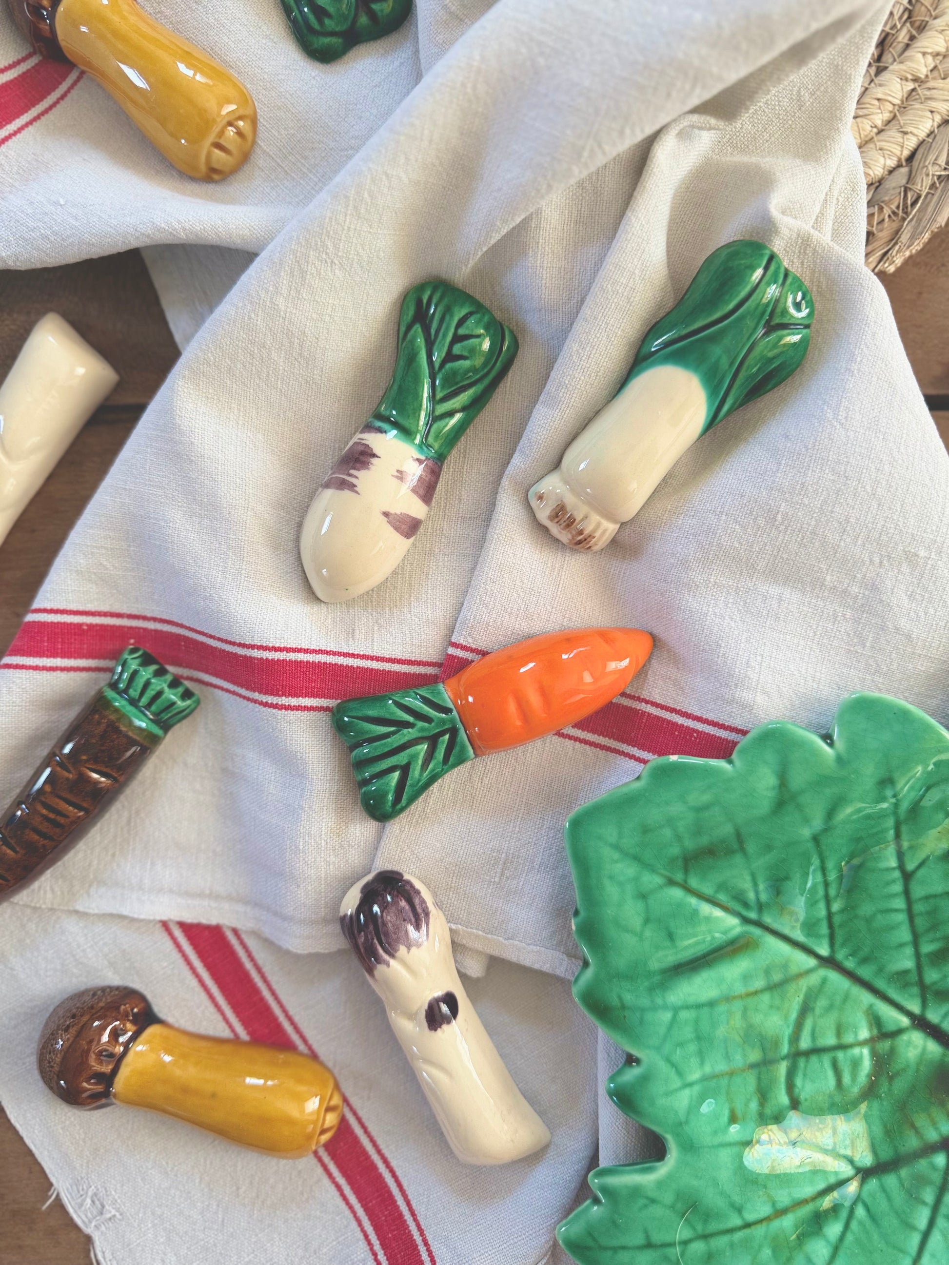 Très belle et rare, ensemble de 12 porte-couteaux en barbotine émaillée en forme de légumes.