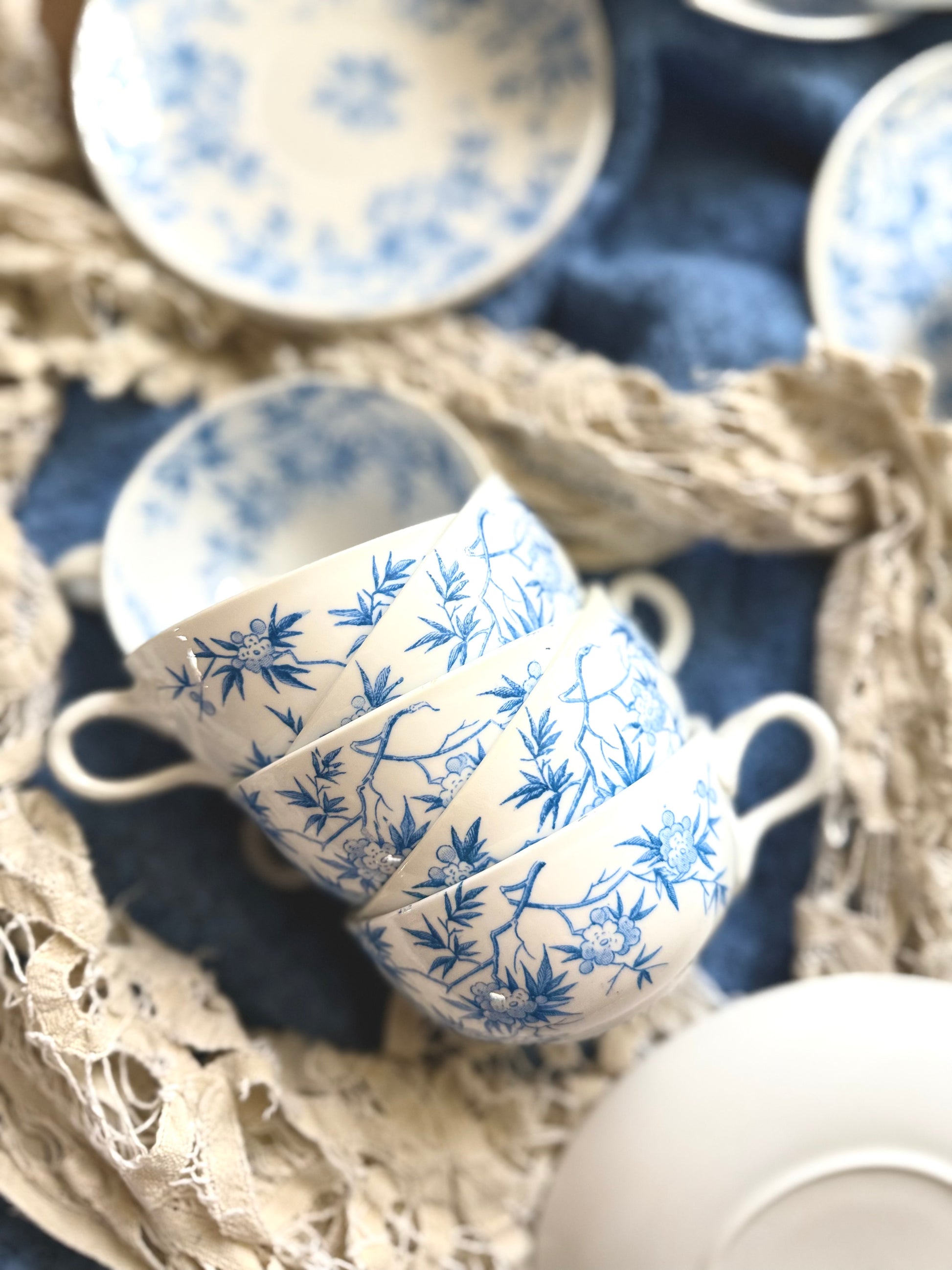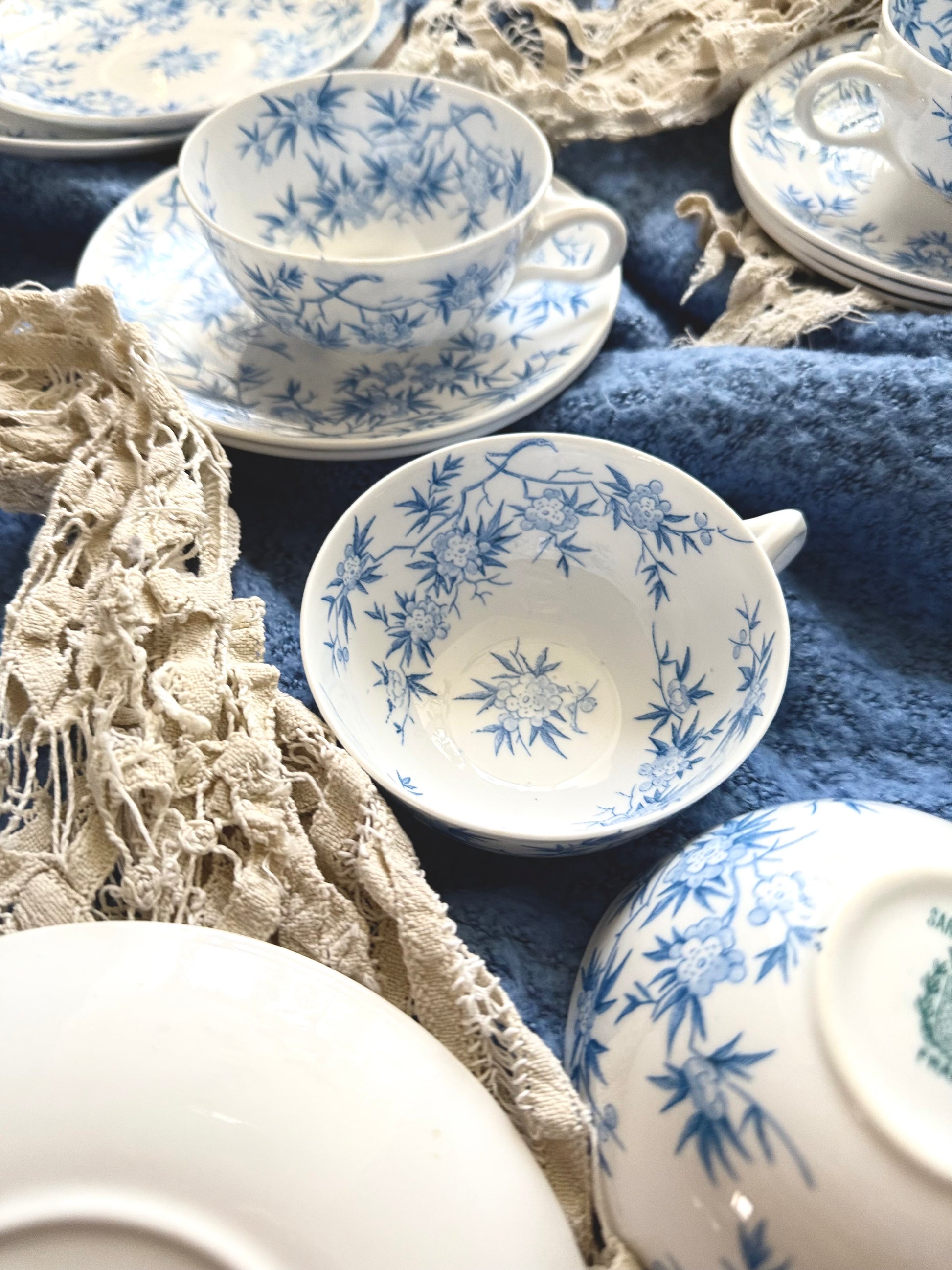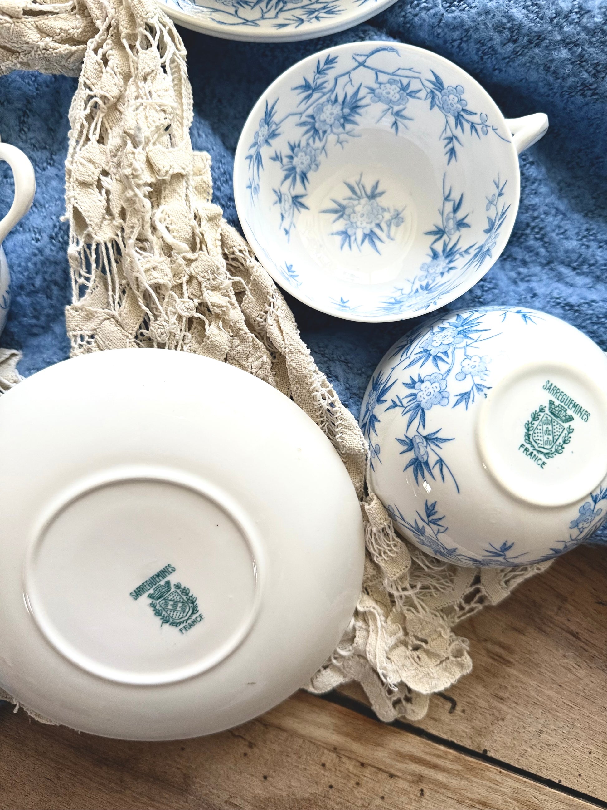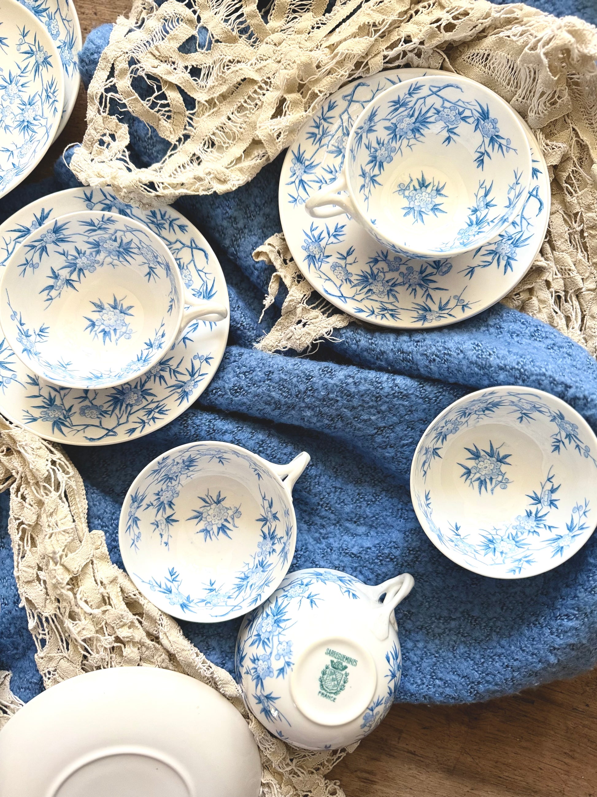 Pour vous réchauffer et dresser un joli « tea-time » je vous propose cet ensemble en faïence fine de la maison Sarreguemines. Modèle nommé « épines » couleur bleu cobalt.