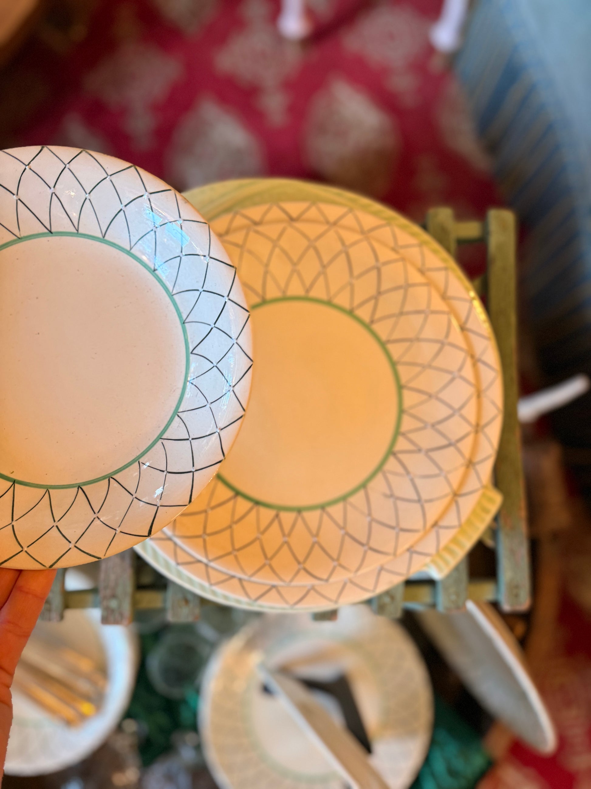 Service de la manufacture de Longchamp en faïence des années 60’s. Fond blanc et décor raffiné peint à la main.